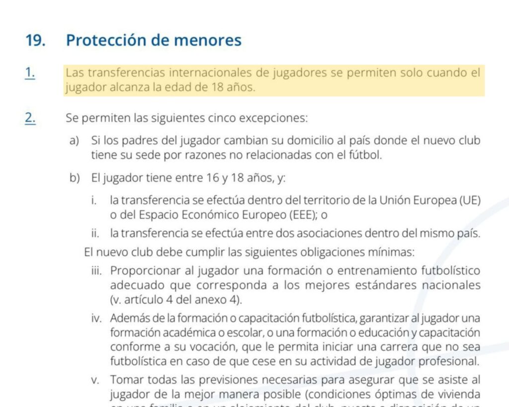 De acuerdo con el Artículo 19 del Reglamento sobre el Estatuto y Transferencias de Jugadores, ningún futbolista menor de 18 años puede ser transferido de manera internacional, esto para evitar situaciones puntuales como la deserción escolar y el abuso en el fútbol de manera global.