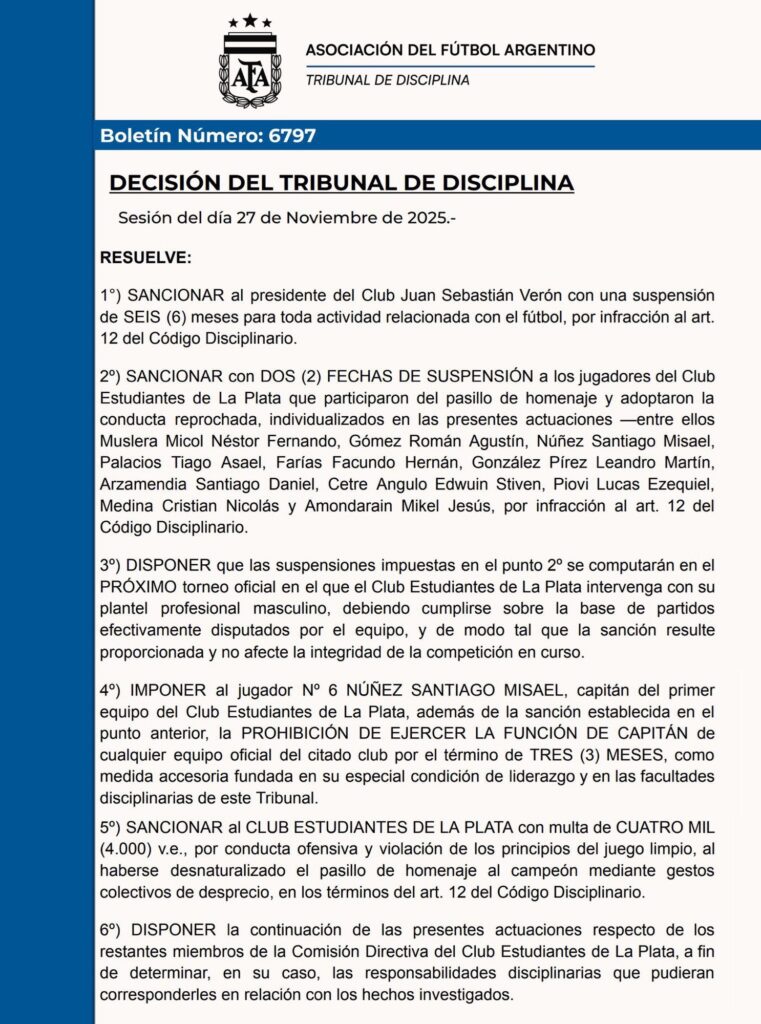 Entre las medidas más severas se encuentra la suspensión por seis meses de Juan Sebastián Verón, presidente de Estudiantes, quien no podrá ejercer funciones relacionadas con el fútbol durante ese periodo.